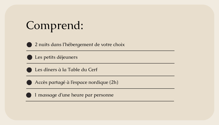 Pour prolonger la détente, un massage d’une heure par personne vient compléter cette expérience, pensée pour relâcher le corps et apaiser l’esprit.