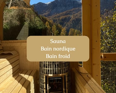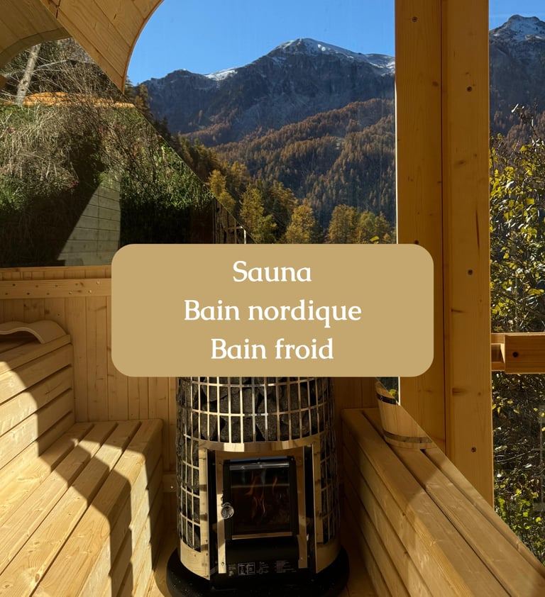 Un bain froid, un braséro et des fauteuils placées face aux montagnes viennent compléter cet espace où la relaxation et la convivialité règne.